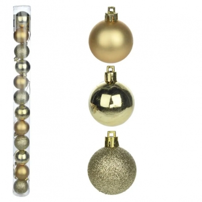 | Um conjunto de 15 bolas de Natal em tom dourado, cada uma com 3cm de diâmetro. Estas bolas adicionam brilho e charme à sua árvore de Natal, criando uma atmosfera festiva. Contém 5 bolas metalizadas, 5 peroladas e 5 glitteradas.  |